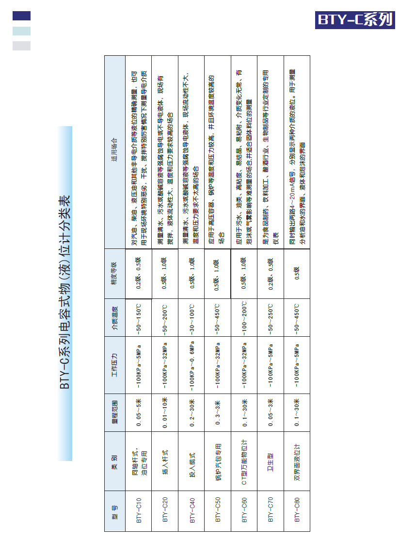 BTY-C系列電容式物位計采用一種基于全數字化電容測量方法,并運用多參數補償技術,研制出一系列高精度的物位計,已經在多個領域試用成功。例如安裝在機動車輛上的電容式油位傳感器,在各種強腐蝕、高溫、劇毒、爆炸等高危險場合使用的電容式高溫高壓液位計,能自動適應各種介質的高精度CT型物位計。這些物位計在有關行業試用,得到了有關行家的一致好評。